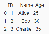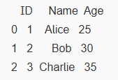 df = pd.DataFrame(data, columns=['ID', 'Name', 'Age'])