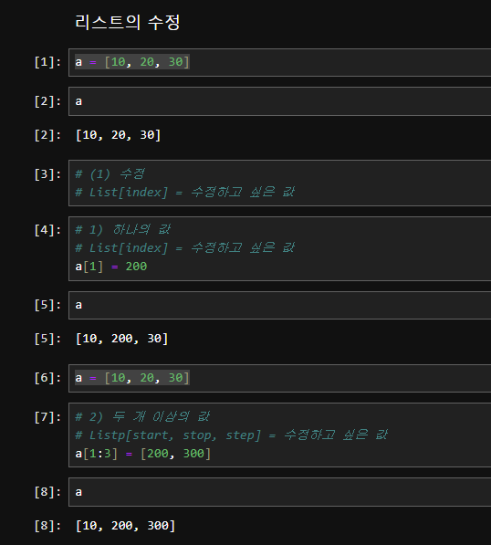 - 인덱스를 사용하여 요소를 가져오거나 변경할 수 있습니다.