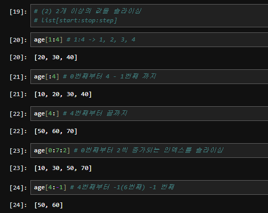 - stop: 슬라이스의 끝 인덱스입니다. 이 인덱스의 요소는 포함되지 않습니다. 생략하면 리스트의 끝까지 포함합니다.